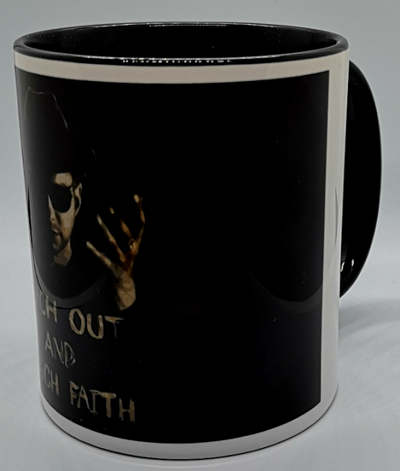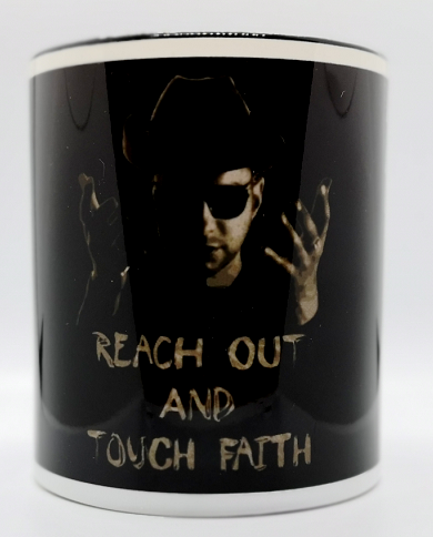 Une tasse aux couleurs du célèbre texte "Reach out and touch faith" du single Personal Jesus de Depeche Mode !
